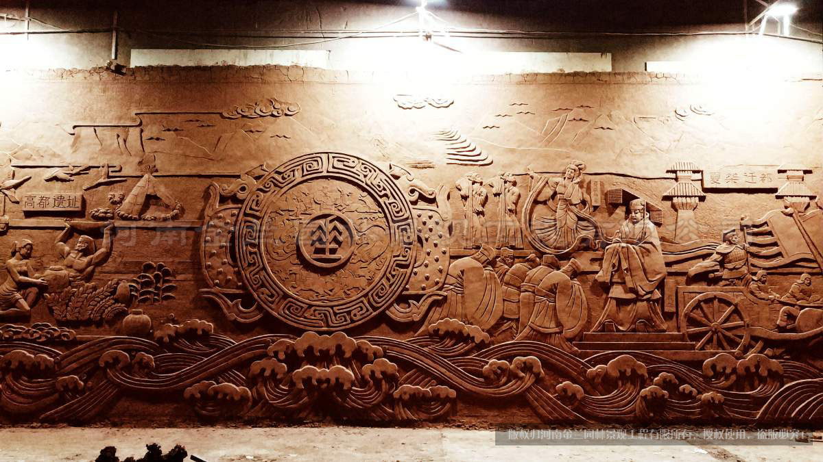 浮雕中央,直径2米的“垂棘之璧”占据核心位置,玉璧中央镶嵌篆体“垂”字——高都镇的古称,既呼应《左传》中“晋献公献垂棘之璧于虞国”的典故,又以极简笔触锚定古镇的历史原点。璧面采用深浮雕技法,纹路模拟美玉的温润质感,与周边仿铜材质的粗犷肌理形成对比,暗合“玉出昆冈”的文化意象。这一设计不仅还原了高都作为“美玉之乡”的历史记忆,更将“垂”字作为贯穿古今的文化符号,串联起浮雕左右两侧的历史长卷。